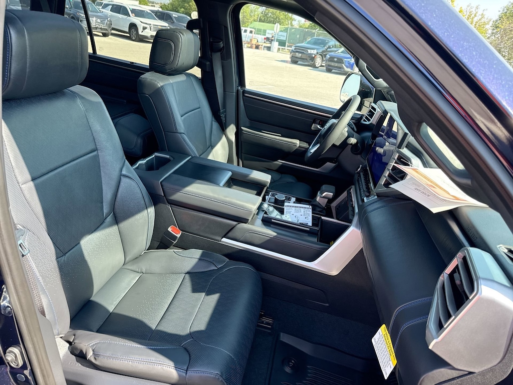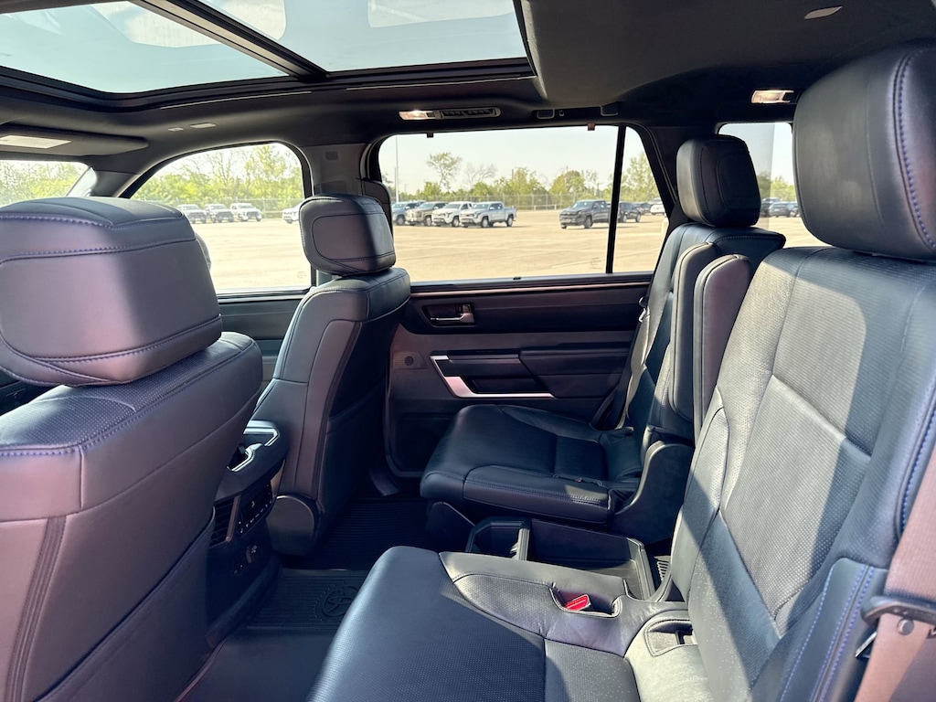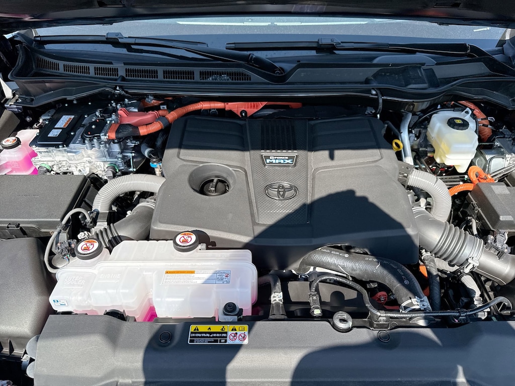 Features: Tow Technology Package (Wireless Trailer Camera System), Toyota Gold Certified Certified, V6 Hybrid, 10-Speed Automatic, 4WD, ABS brakes, Active Cruise Control, Alloy wheels, Compass, Electronic Stability Control, Front dual zone A/C, Heated & Ventilated Front Seats, Heated door mirrors, Heated front seats, Heated rear seats, Illuminated entry, Low tire pressure warning, Power Liftgate, Power moonroof, Premium Leather Seat Trim, Remote keyless entry, Traction control, 14 Speakers, 3rd row seats: split-bench, 4-Wheel Disc Brakes, Air Conditioning, AM/FM radio: SiriusXM, Anti-whiplash front head restraints, Apple CarPlay/Android Auto, Auto High-beam Headlights, Auto tilt-away steering wheel, Auto-dimming door mirrors, Auto-dimming Rear-View mirror, Automatic temperature control, Brake assist, Bumpers: body-color, Delay-off headlights, Driver door bin, Driver vanity mirror, Dual front impact airbags, Dual front side impact airbags, Emergency communication system: Safety Connect (10-year trial), Exterior Parking Camera Rear, Front anti-roll bar, Front Bucket Seats, Front Center Armrest w/Storage, Front fog lights, Front reading lights, Front wheel independent suspension, Fully automatic headlights, Garage door transmitter: HomeLink, Head Up Display (HUD), Headlight cleaning, Heated steering wheel, Knee airbag, Leather steering wheel, Memory seat, Navigation system: Drive Connect (1 year trial) includes Cloud Navigation with real time traffic and Google POI, Occupant sensing airbag, Outside temperature display, Overhead airbag, Overhead console, Panic alarm, Passenger door bin, Passenger vanity mirror, Power door mirrors, Power driver seat, Power passenger seat, Power steering, Power windows, Premium audio system: JBL, Radio: 14" Toyota Audio Multimedia w/JBL Prem Aud, Rain sensing wipers, Rear air conditioning, Rear reading lights, Rear seat center armrest, Rear window defroster, Rear window wiper, Reclining 3rd row seat, Security system, Speed control, Speed-sensing steering, Split folding rear seat, Spoiler, Steering wheel mounted audio controls, Tachometer, Telescoping steering wheel, Tilt steering wheel, Trip computer, Turn signal indicator mirrors, Variably intermittent wipers, Ventilated front seats, Ventilated rear seats, Voltmeter, and Wheels: 20" Machined-Finish Black Alloy.