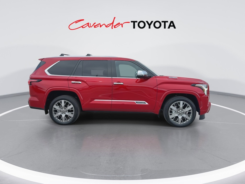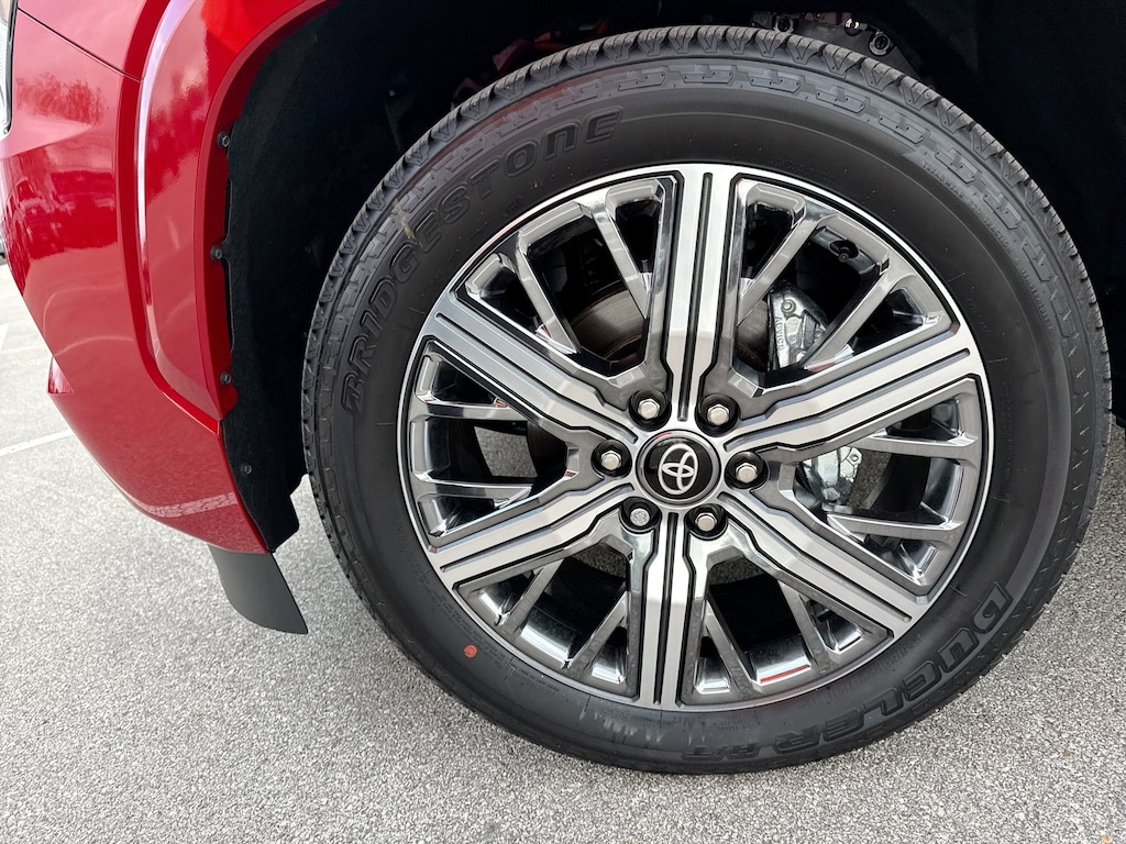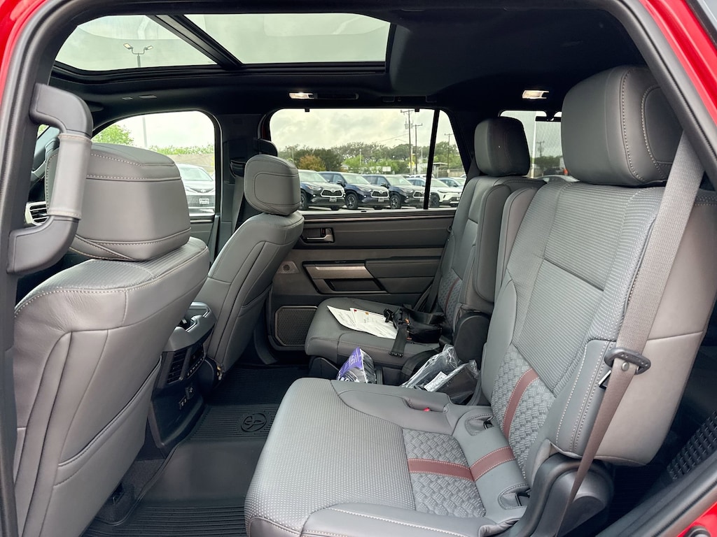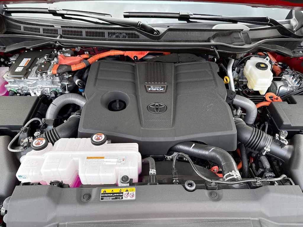 Features: Capstone Grade Package, Tow Technology Package (Wireless Trailer Camera System), Toyota Gold Certified Certified, V6 Hybrid, 10-Speed Automatic, 4WD, ABS brakes, Active Cruise Control, Alloy wheels, Compass, Electronic Stability Control, Front dual zone A/C, Heated door mirrors, Heated front seats, Heated rear seats, Illuminated entry, Leather Seat Trim, Low tire pressure warning, Navigation System, Power Liftgate, Power moonroof, Remote keyless entry, Traction control, 14 Speakers, 3rd row seats: split-bench, 4-Wheel Disc Brakes, Air Conditioning, AM/FM radio: SiriusXM, Anti-whiplash front head restraints, Apple CarPlay/Android Auto, Auto High-beam Headlights, Auto tilt-away steering wheel, Auto-dimming door mirrors, Auto-dimming Rear-View mirror, Automatic temperature control, Brake assist, Bumpers: body-color, Delay-off headlights, Driver door bin, Driver vanity mirror, Dual front impact airbags, Dual front side impact airbags, Emergency communication system: Safety Connect (10-year trial), Exterior Parking Camera Rear, Front anti-roll bar, Front Bucket Seats, Front Center Armrest w/Storage, Front fog lights, Front reading lights, Front wheel independent suspension, Fully automatic headlights, Garage door transmitter: HomeLink, Genuine wood door panel insert, Headlight cleaning, Heads-Up Display, Heated and Ventilated Front Seats, Heated steering wheel, Knee airbag, Leather Shift Knob, Leather steering wheel, Memory seat, Navigation system: Drive Connect (1 year trial) includes Cloud Navigation with real time traffic and Google POI, Occupant sensing airbag, Outside temperature display, Overhead airbag, Overhead console, Panic alarm, Passenger door bin, Passenger vanity mirror, Power door mirrors, Power driver seat, Power passenger seat, Power steering, Power windows, Premium audio system: JBL, Radio: 14" Toyota Audio Multimedia with JBL Premium Audio, Rain sensing wipers, Rear air conditioning, Rear reading lights, Rear seat center armrest, Rear window defroster, Rear window wiper, Reclining 3rd row seat, Security system, Speed control, Speed-sensing steering, Split folding rear seat, Spoiler, Sport steering wheel, Steering wheel mounted audio controls, Tachometer, Telescoping steering wheel, Tilt steering wheel, Trip computer, Turn signal indicator mirrors, Variably intermittent wipers, Ventilated front seats, Ventilated rear seats, Voltmeter, and Wheels: 22" Dark Chrome Machined-Finish Alloy.