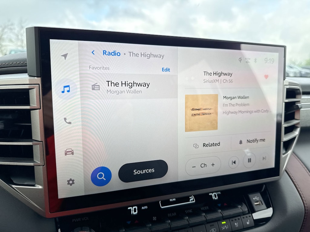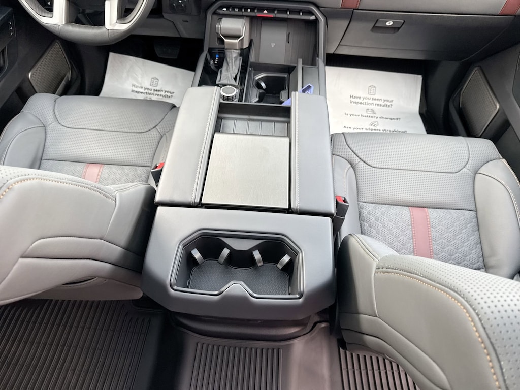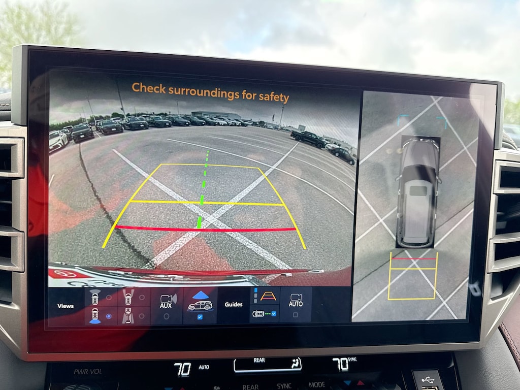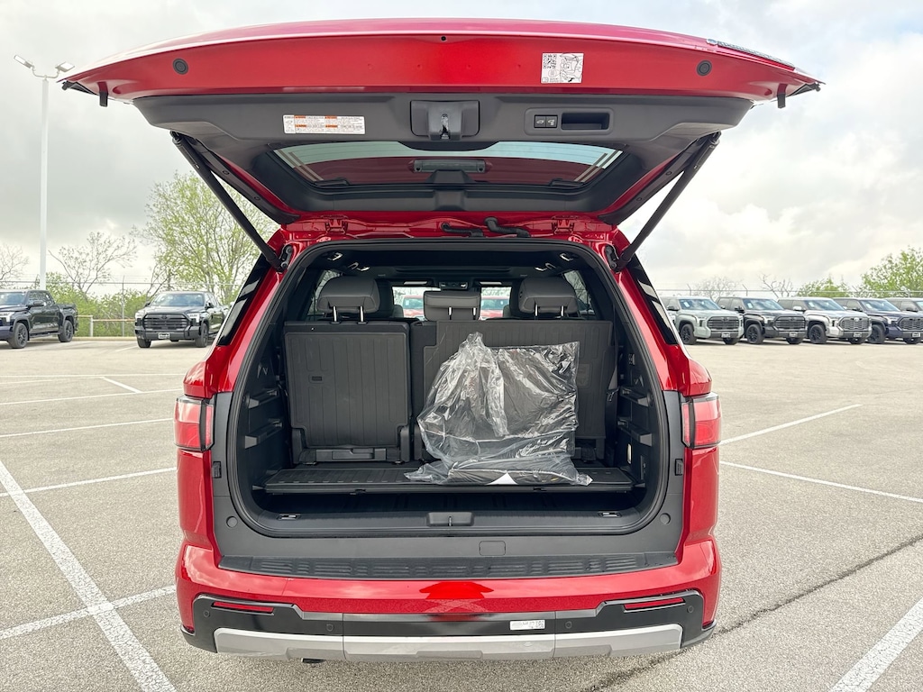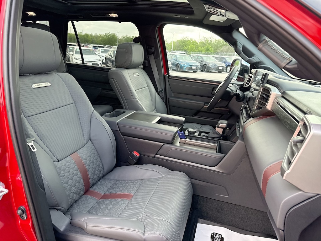 Features: Capstone Grade Package, Tow Technology Package (Wireless Trailer Camera System), Toyota Gold Certified Certified, V6 Hybrid, 10-Speed Automatic, 4WD, ABS brakes, Active Cruise Control, Alloy wheels, Compass, Electronic Stability Control, Front dual zone A/C, Heated door mirrors, Heated front seats, Heated rear seats, Illuminated entry, Leather Seat Trim, Low tire pressure warning, Navigation System, Power Liftgate, Power moonroof, Remote keyless entry, Traction control, 14 Speakers, 3rd row seats: split-bench, 4-Wheel Disc Brakes, Air Conditioning, AM/FM radio: SiriusXM, Anti-whiplash front head restraints, Apple CarPlay/Android Auto, Auto High-beam Headlights, Auto tilt-away steering wheel, Auto-dimming door mirrors, Auto-dimming Rear-View mirror, Automatic temperature control, Brake assist, Bumpers: body-color, Delay-off headlights, Driver door bin, Driver vanity mirror, Dual front impact airbags, Dual front side impact airbags, Emergency communication system: Safety Connect (10-year trial), Exterior Parking Camera Rear, Front anti-roll bar, Front Bucket Seats, Front Center Armrest w/Storage, Front fog lights, Front reading lights, Front wheel independent suspension, Fully automatic headlights, Garage door transmitter: HomeLink, Genuine wood door panel insert, Headlight cleaning, Heads-Up Display, Heated and Ventilated Front Seats, Heated steering wheel, Knee airbag, Leather Shift Knob, Leather steering wheel, Memory seat, Navigation system: Drive Connect (1 year trial) includes Cloud Navigation with real time traffic and Google POI, Occupant sensing airbag, Outside temperature display, Overhead airbag, Overhead console, Panic alarm, Passenger door bin, Passenger vanity mirror, Power door mirrors, Power driver seat, Power passenger seat, Power steering, Power windows, Premium audio system: JBL, Radio: 14" Toyota Audio Multimedia with JBL Premium Audio, Rain sensing wipers, Rear air conditioning, Rear reading lights, Rear seat center armrest, Rear window defroster, Rear window wiper, Reclining 3rd row seat, Security system, Speed control, Speed-sensing steering, Split folding rear seat, Spoiler, Sport steering wheel, Steering wheel mounted audio controls, Tachometer, Telescoping steering wheel, Tilt steering wheel, Trip computer, Turn signal indicator mirrors, Variably intermittent wipers, Ventilated front seats, Ventilated rear seats, Voltmeter, and Wheels: 22" Dark Chrome Machined-Finish Alloy.