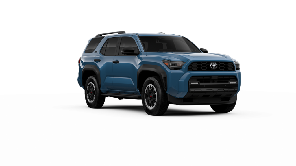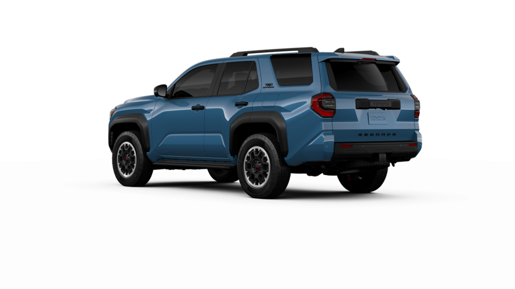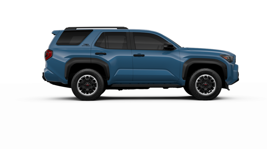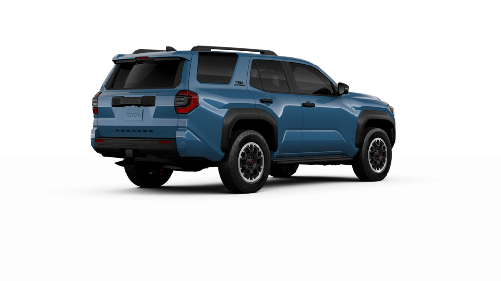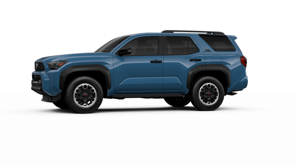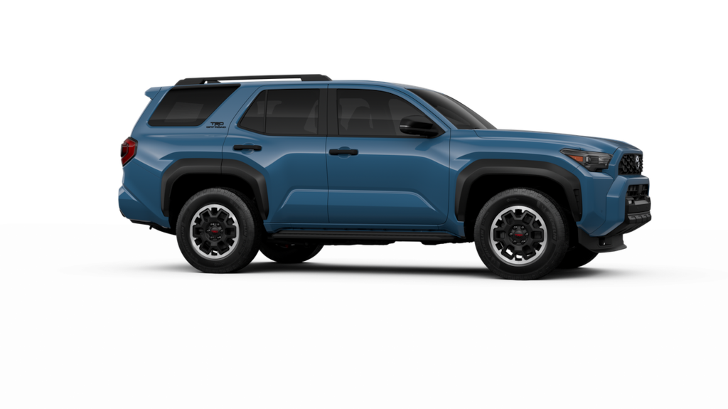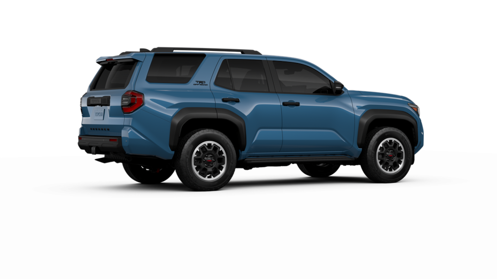 - Black honeycomb-style grille, mirror caps, door handles, and overfenders; color-keyed rear spoiler; black "trd off road" and "4runner" badges.