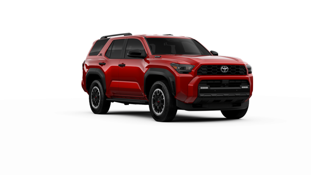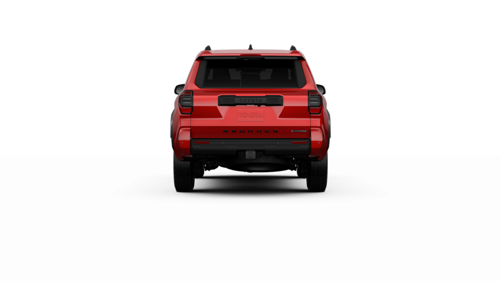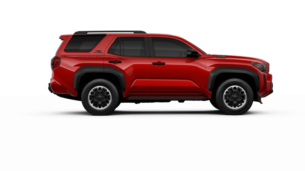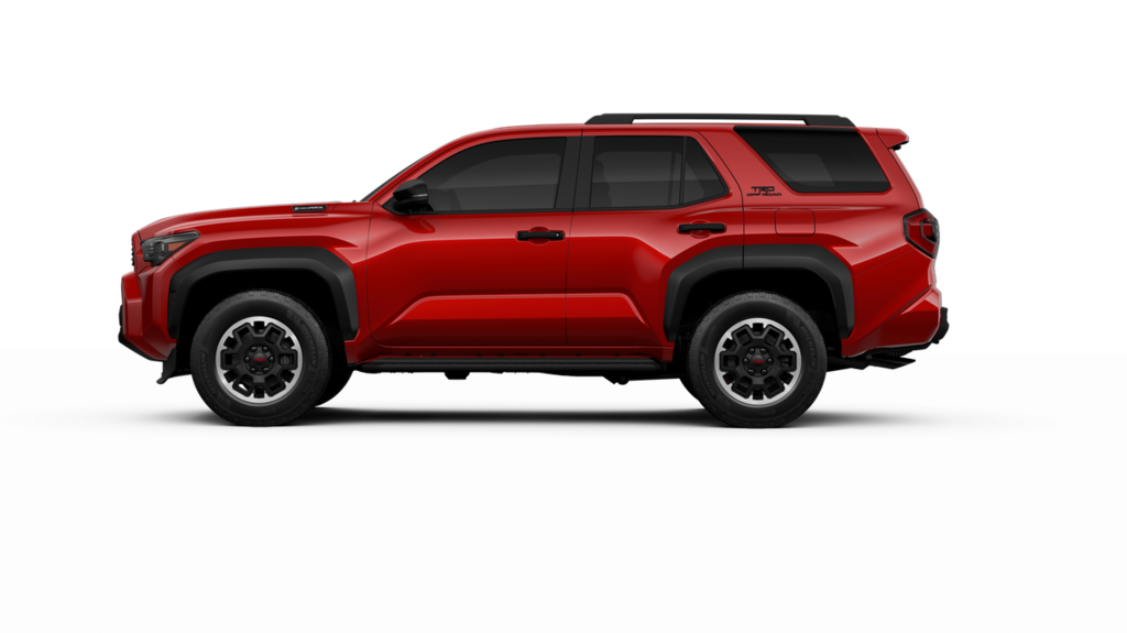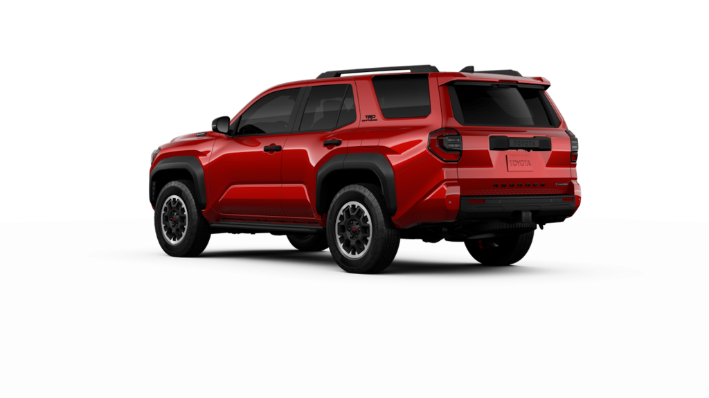- Black honeycomb-style grille, mirror caps, door handles, and overfenders; color-keyed rear spoiler; black "trd off road" and "4runner" badges.