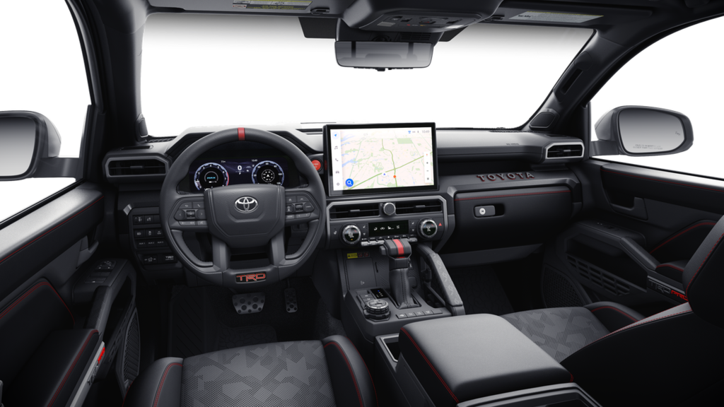 - Trd pro leather-trimmed manual tilt/telescopic steering wheel with trd badge, red center stripe, and phone, audio, display/infotainment, and driver assist controls.
