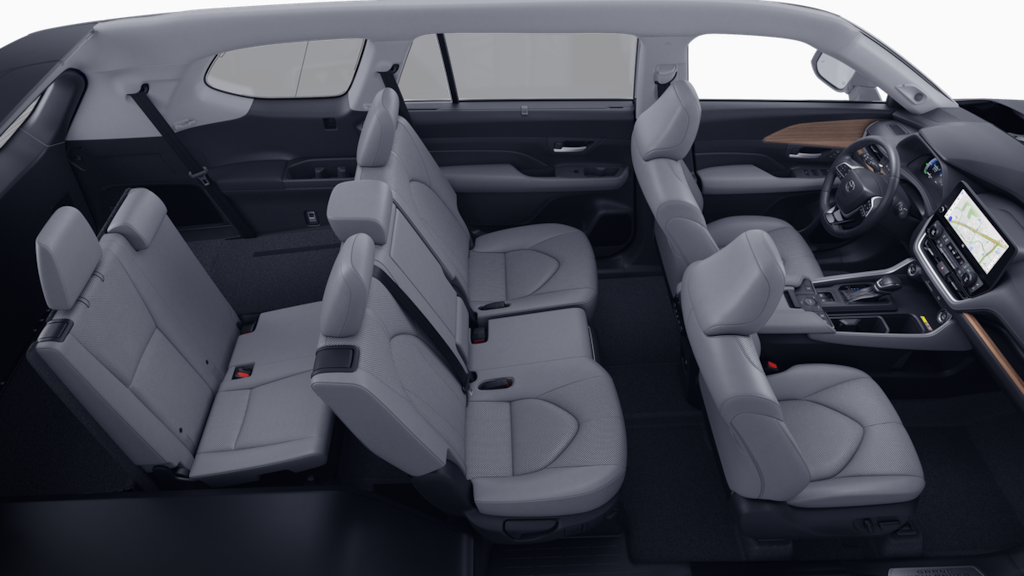 • 7-passenger seating with second-row fold-down captain's chairs and fold-down inboard armrests, adjustable headrests and two cup holders mounted on the floor; and 60/40 split, fold-down third-row seats with sliding headrests and recline function.