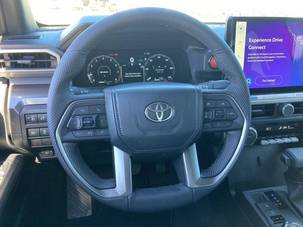 - Leather-trimmed manual tilt/telescopic steering wheel with phone, audio, display/infotainment, and driver assist controls.