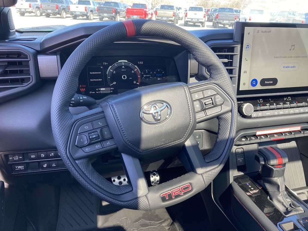 - Trd leather-wrapped manual tilt/telescopic steering wheel with trd badge, red center stripe, and phone, audio, display/infotainment, and driver assist controls.