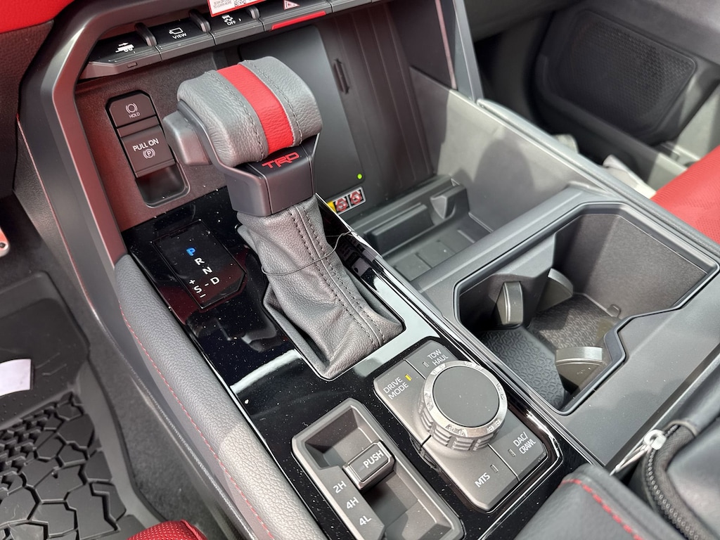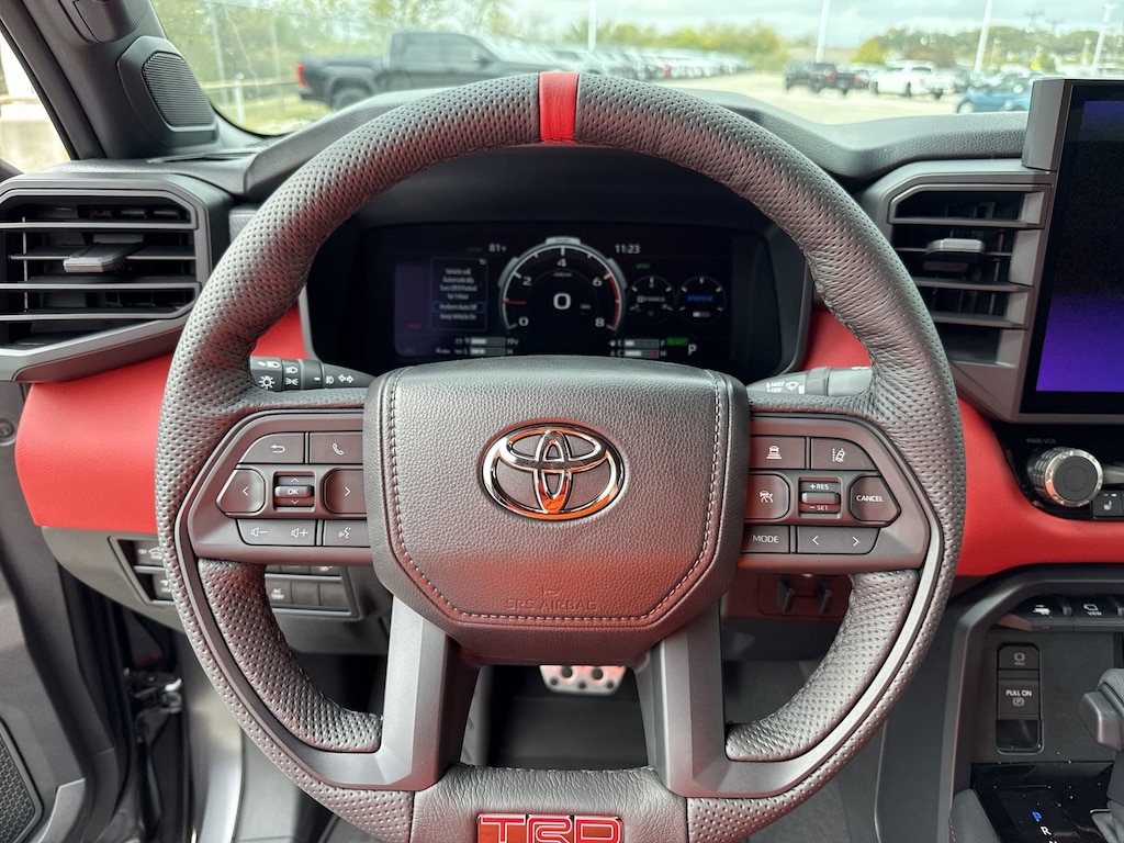 - Trd leather-wrapped manual tilt/telescopic steering wheel with trd badge, red center stripe, and phone, audio, display/infotainment, and driver assist controls.
