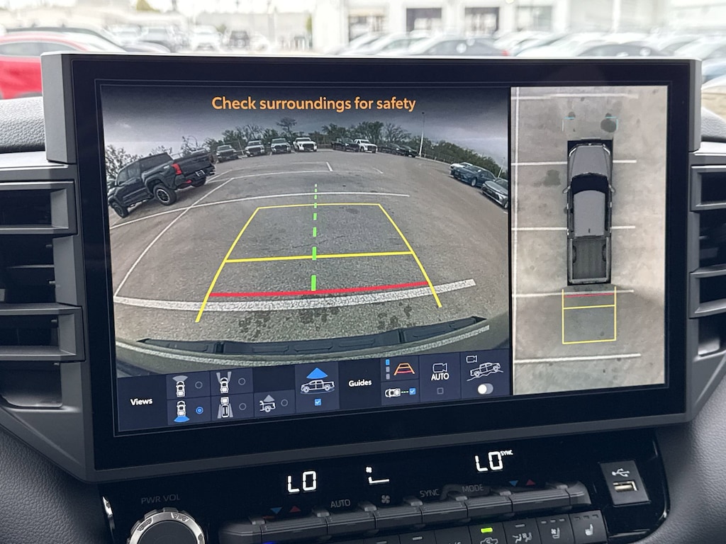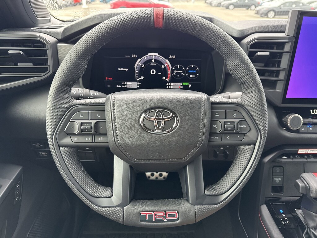 - Trd leather-wrapped manual tilt/telescopic steering wheel with trd badge, red center stripe, and phone, audio, display/infotainment, and driver assist controls.