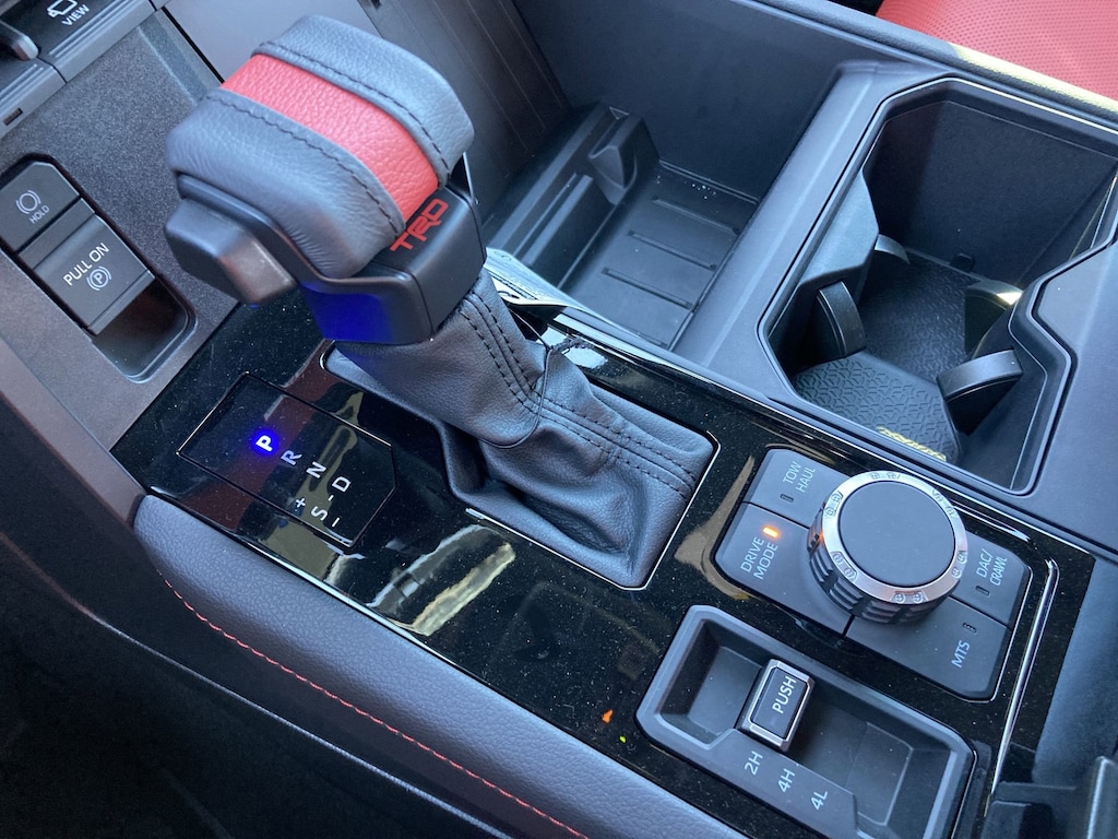 - Trd leather-wrapped manual tilt/telescopic steering wheel with trd badge, red center stripe, and phone, audio, display/infotainment, and driver assist controls.