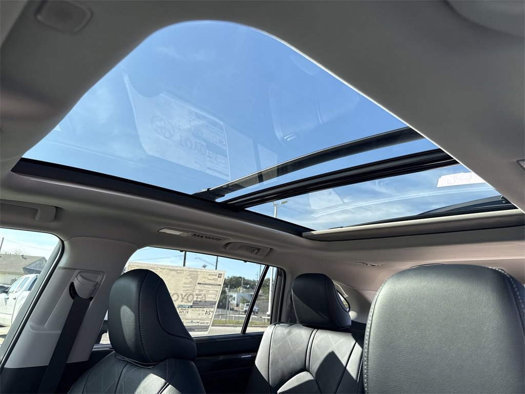 Features: Platinum Package, AWD, ABS brakes, Active Cruise Control, Alloy wheels, Electronic Stability Control, Front dual zone A/C, Heated door mirrors, Heated front seats, Heated rear seats, Illuminated entry, Leather Seat Trim, Low tire pressure warning, Navigation System, Power Liftgate, Power moonroof, Remote keyless entry, Traction control, 11 Speakers, 20" Painted Alloy Wheels, 3rd row seats: split-bench, 4-Wheel Disc Brakes, Air Conditioning, AM/FM radio: SiriusXM, Apple CarPlay/Android Auto, Auto High-beam Headlights, Auto-dimming Rear-View mirror, Automatic temperature control, Brake assist, Bumpers: body-color, Delay-off headlights, Driver door bin, Driver vanity mirror, Dual front impact airbags, Dual front side impact airbags, Emergency communication system: Safety Connect (up to 10-year trial subscription), Exterior Parking Camera Rear, Four wheel independent suspension, Front anti-roll bar, Front Bucket Seats, Front Center Armrest, Front fog lights, Front reading lights, Fully automatic headlights, Garage door transmitter: HomeLink, Heads-Up Display, Heated & Ventilated Front Captain Seats, Heated steering wheel, Knee airbag, Leather Shift Knob, Leather steering wheel, Memory seat, Navigation system: Drive Connect Cloud Navigation (1-year trial subscription), Occupant sensing airbag, Outside temperature display, Overhead airbag, Overhead console, Panic alarm, Passenger door bin, Passenger vanity mirror, Power door mirrors, Power driver seat, Power passenger seat, Power steering, Power windows, Radio: 12.3" Toyota Audio Multimedia w/JBL Premium, Rain sensing wipers, Rear air conditioning, Rear anti-roll bar, Rear reading lights, Rear window defroster, Rear window wiper, Reclining 3rd row seat, Security system, Speed control, Speed-sensing steering, Split folding rear seat, Spoiler, Steering wheel mounted audio controls, Tachometer, Telescoping steering wheel, Tilt steering wheel, Trip computer, Turn signal indicator mirrors, Variably intermittent wipers, and Ventilated front seats.